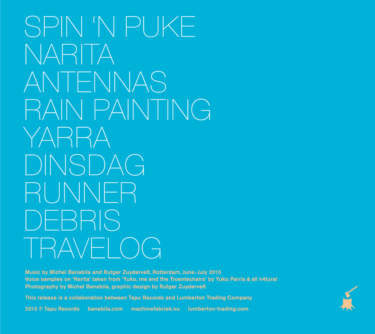 Matte laminated four panel packaging . 'Travelog' comes housed in a full color digipak, graced with photography by Michel Banabila, designed by Rutger Zuydervelt. A release by Tapu Records in collaboration with Lumberton Trading Company.